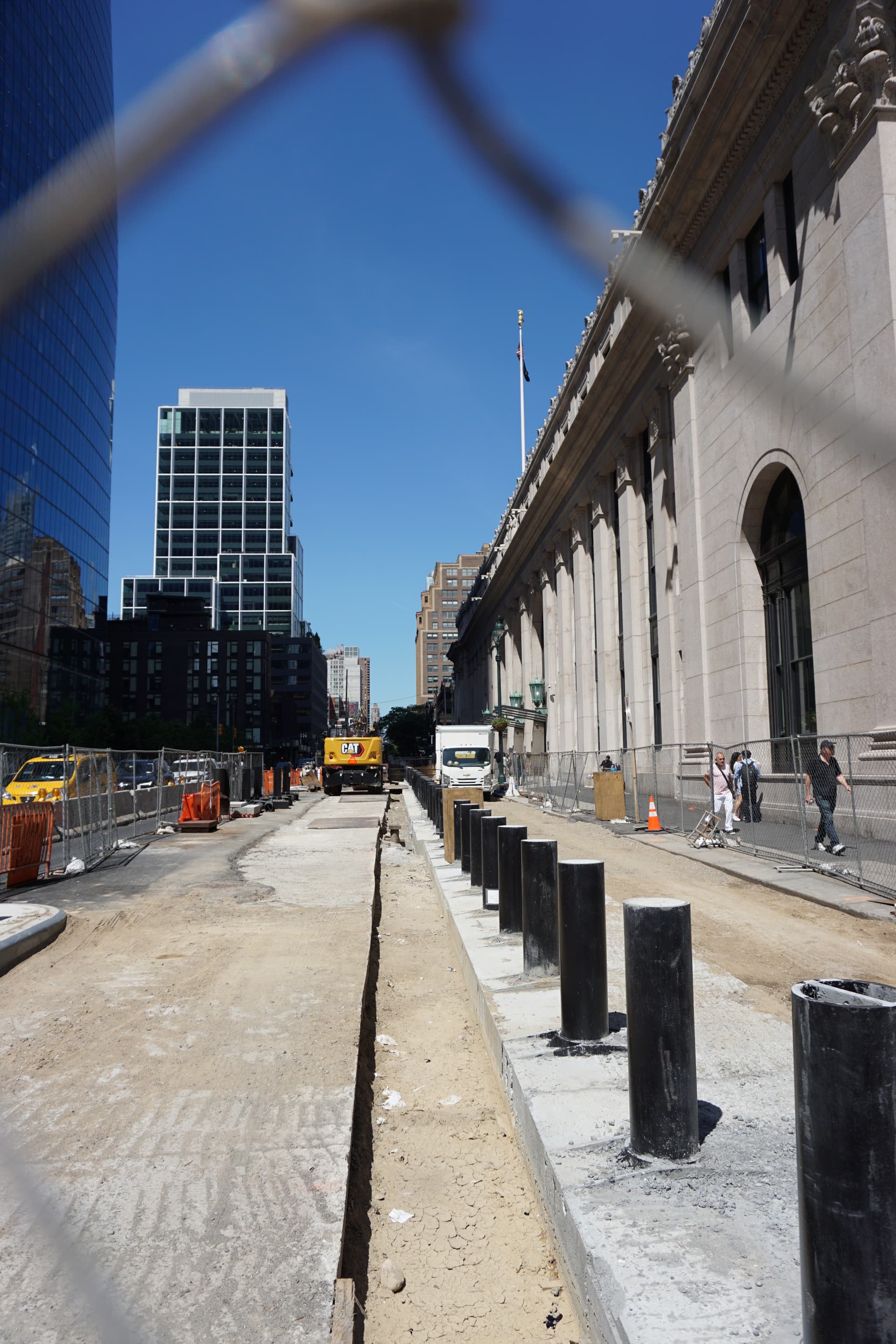 So much progress and I’m always happy to see it!, They’ve also started installing the long line of bollards that mark the eventually extend of the new sidewalk on the 9th Ave side of Farley.