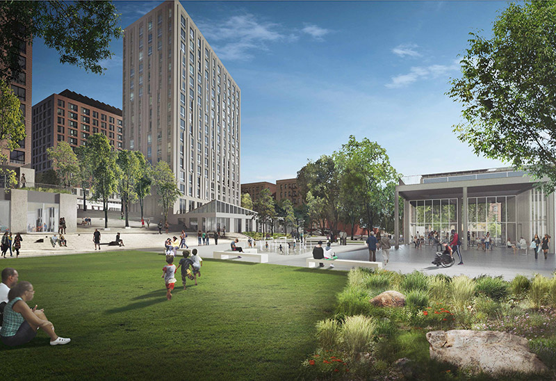 This phase consists of two mixed-income buildings, referred to as 2A & 2B, that will generate 359 apartments. The units are a mix of studios through four-bedroom apartments, with 73% of the units at or below 60% of area median income and 15% of the units set aside for households for the formerly homeless. The amenity package is slated to include a gym, in-building laundry, children’s playroom, tenant lounge space with access to outdoor terraces, common area and apartment Wi-Fi; and bicycle storage. The second phase will also include a 50,000-square-foot public open space plaza, a parking garage with 155 parking spaces, and 20,000 square feet of community facility space. The two buildings also have sustainable design elements that harvest rainwater, along with solar roof panels.