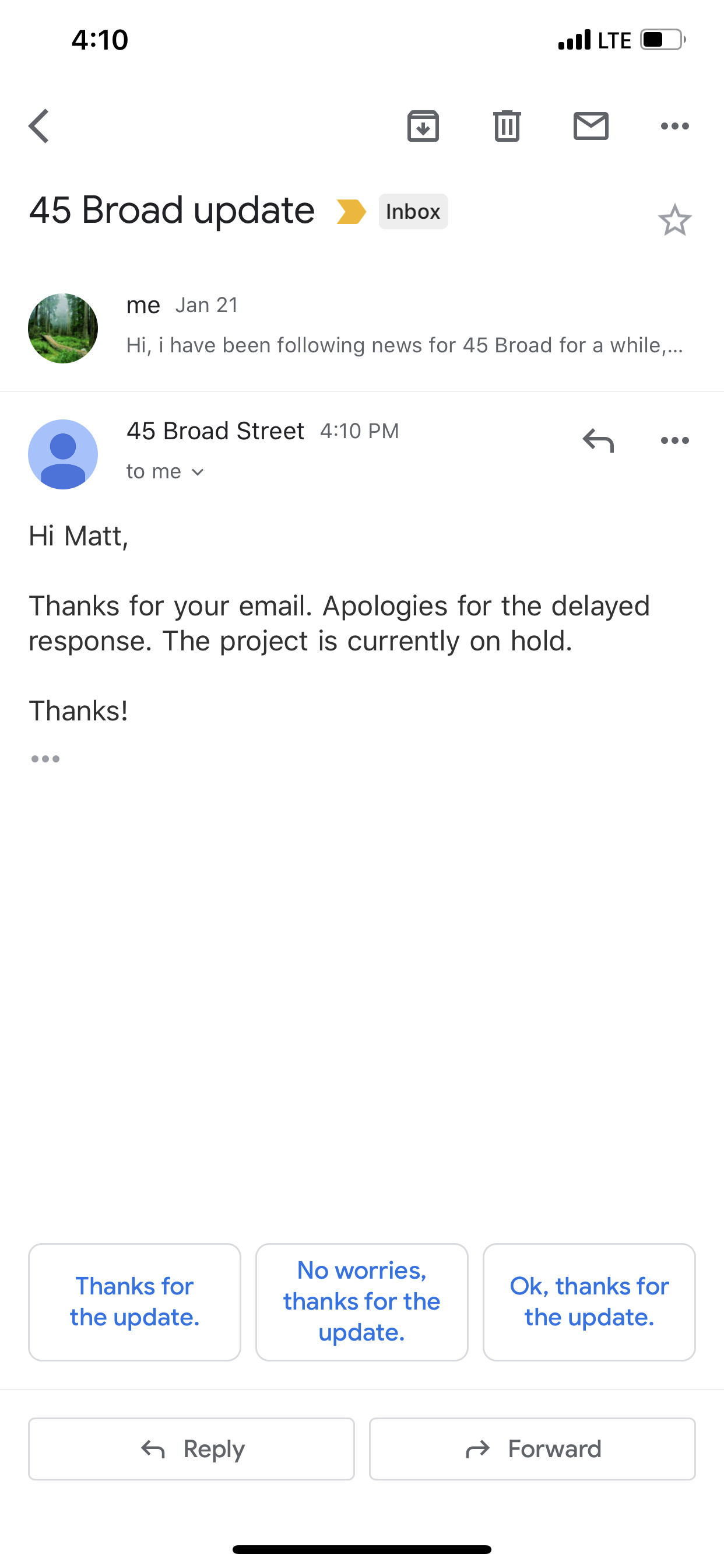 I think 45 Broad will initiate construction within the next two years, in the next up-cycle. The economy will recover, obviously.The current downturn is entirely pandemic-related, and global in nature, not limited to NYC or the financial district. There will be a pool of buyers for small, high-end condo units in the financial district.