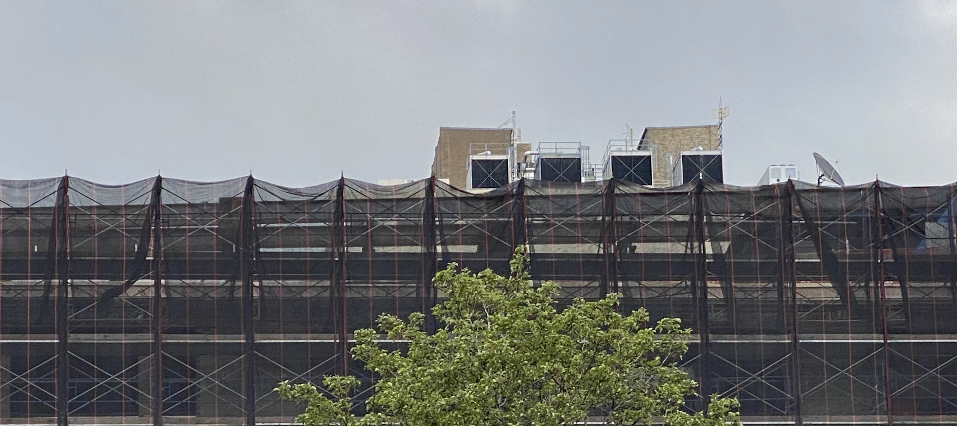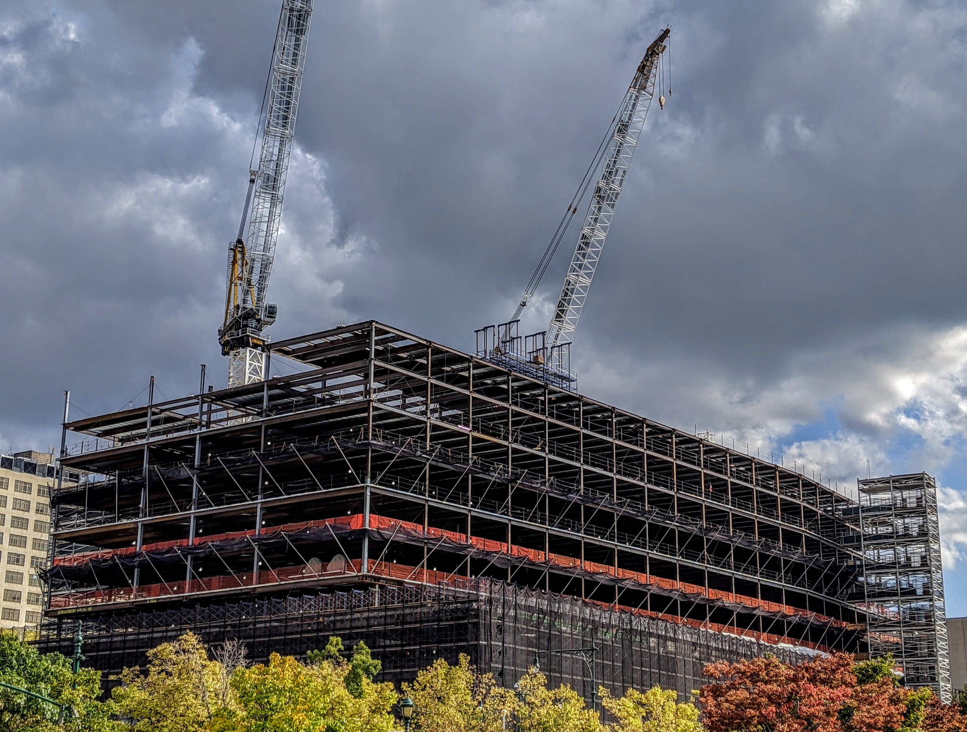 Hard to tell behind scaffolding, but this project is beginning to go vertical.
