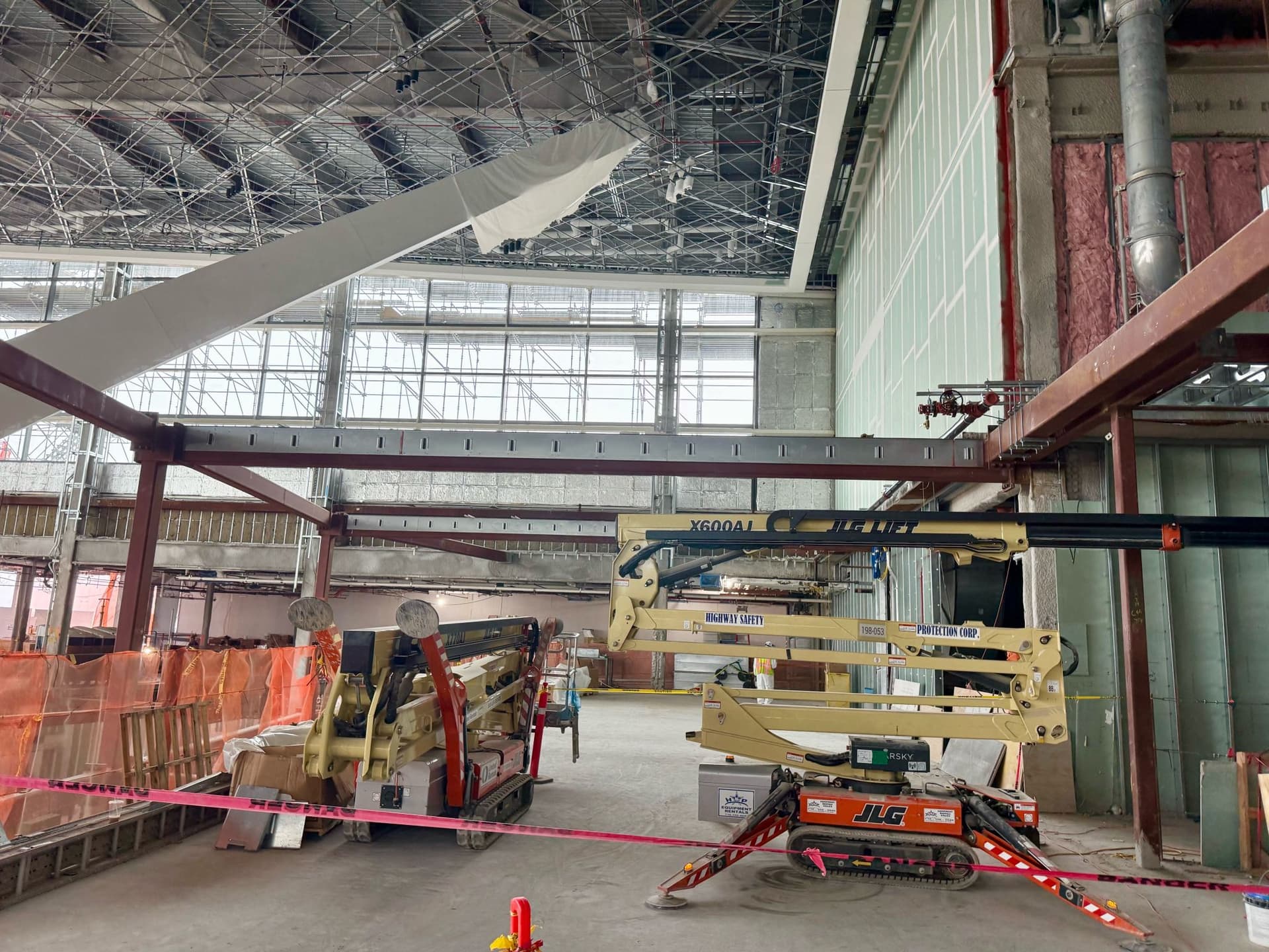 In the last picture, it looks like the design of the center spine may have been simplified, with what appears to be the same ceiling treatment as the rest of the headhouse being installed instead of the perforated structure seen in renderings.