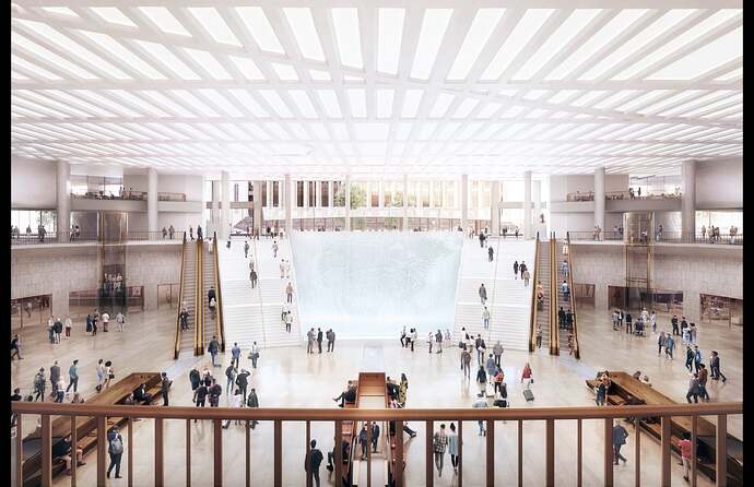 I still like the initial proposal more (in regards to the interior fitout). There was just more color and rhythm to it and a good sense of warm and cool tones, the amount of stone and warm colors on the interior of the new iteration is extremely overwhelming and that adds to the almost claustrophobic feeling I get when looking at the interior. Because the previous version had more glass, it felt more open and transparent.